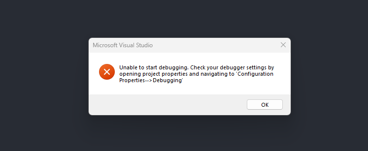 "Unable to start debugging. Check your debugger settings by opening project properties .... " ์ค๋ฅ ๋ฉ์ธ์ง ์ฐฝ์ด ๋จ๋ฉด