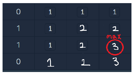 board[i][j] = 1 + min({board[i-1][j-1], board[i-1][j], board[i][j-1]});
