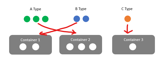 - No two balls of the same type are located in different containers.