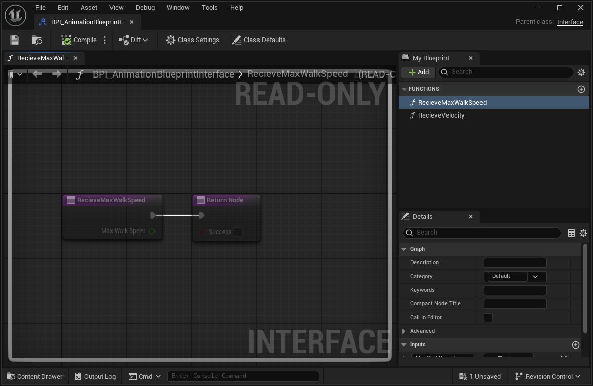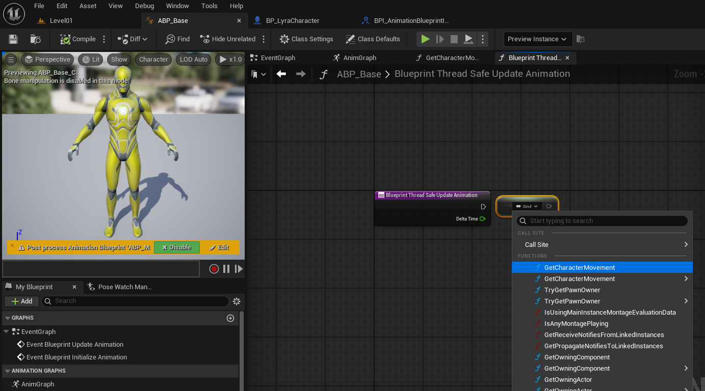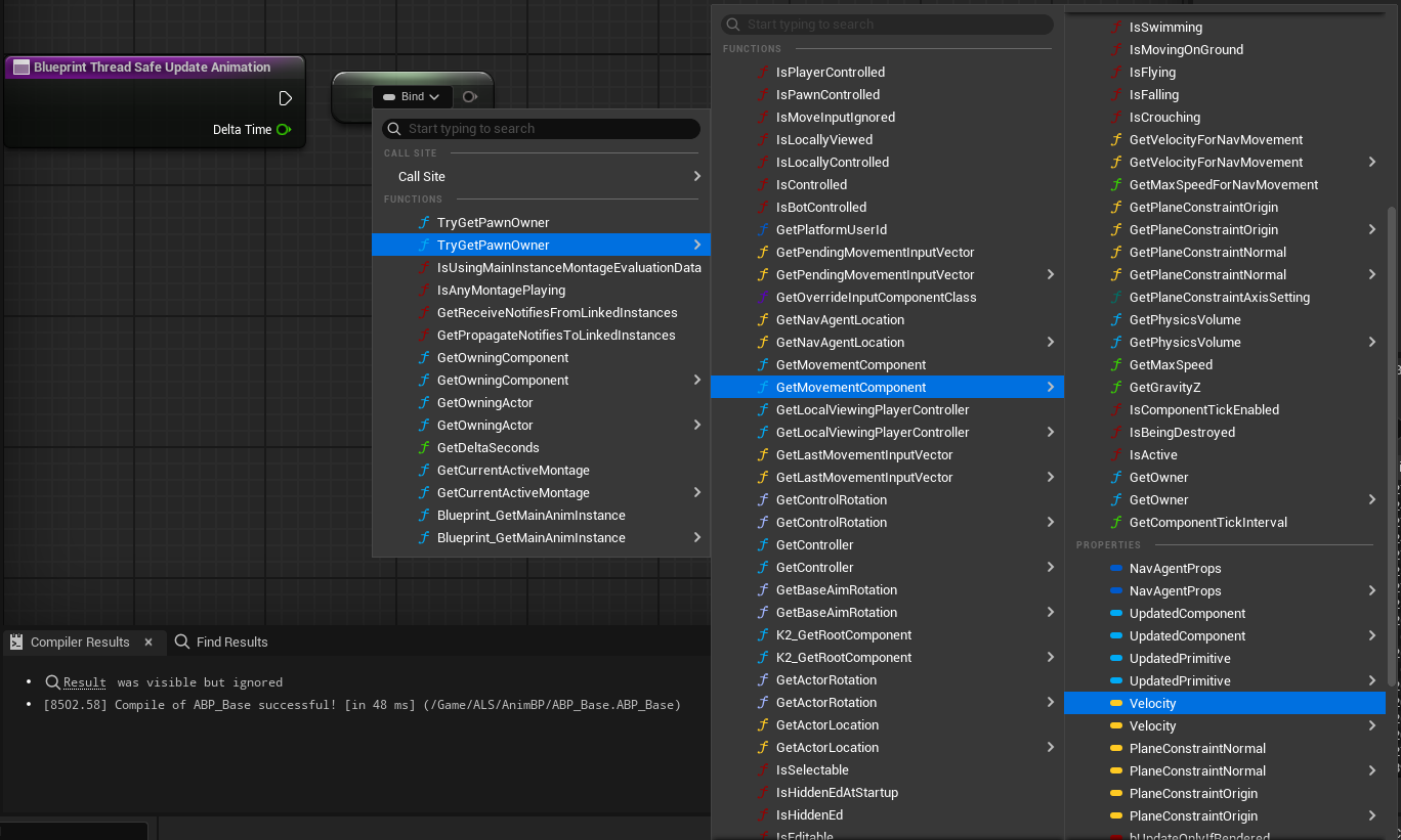 ⇒ ABP에 커스텀 함수 GetCharacerMovement를 추가하여 Property Access 노드로 가져온 Movement Component를CharacterMovement Component로 캐스팅하여 Return 해주면 된다.
