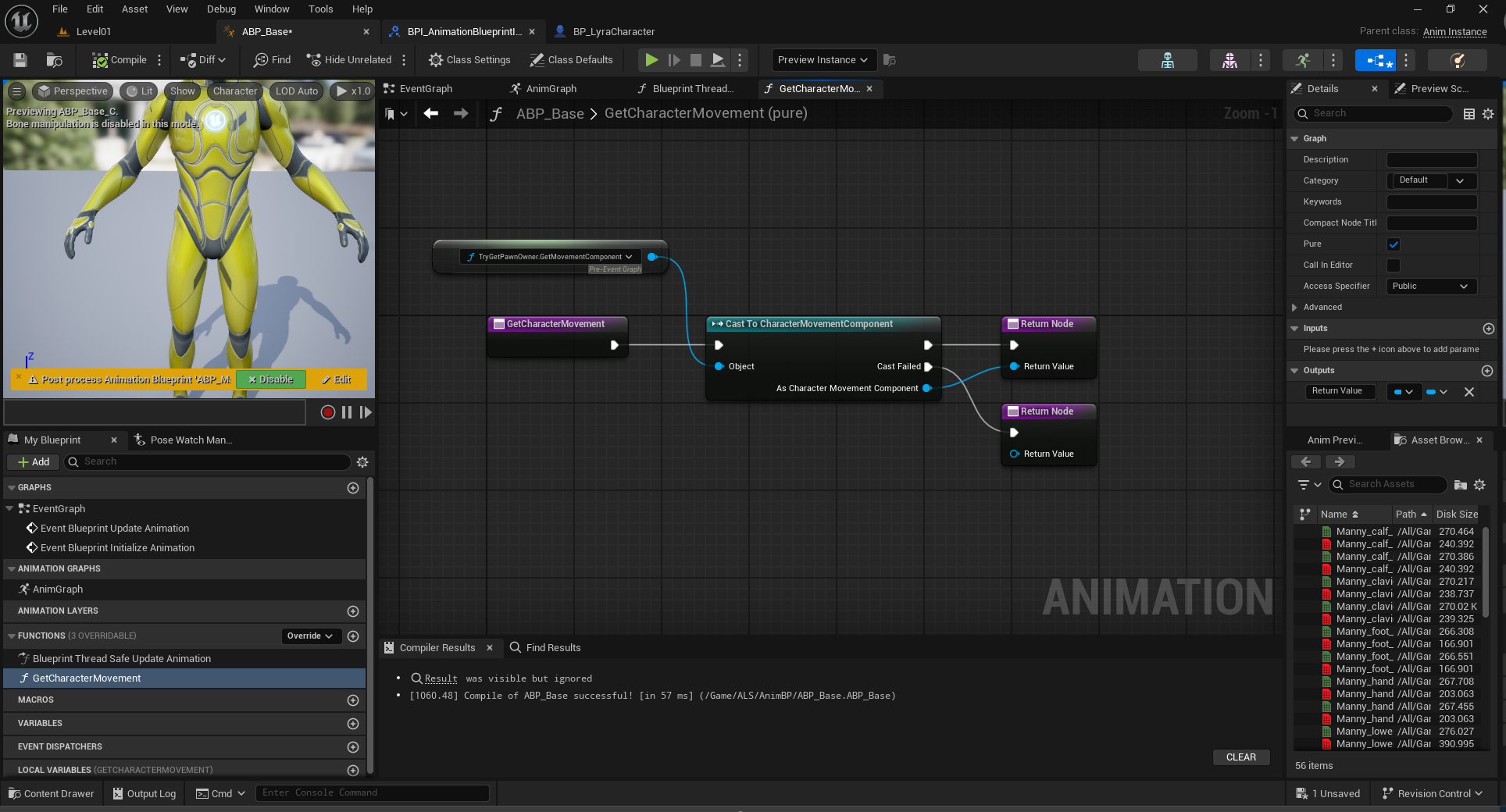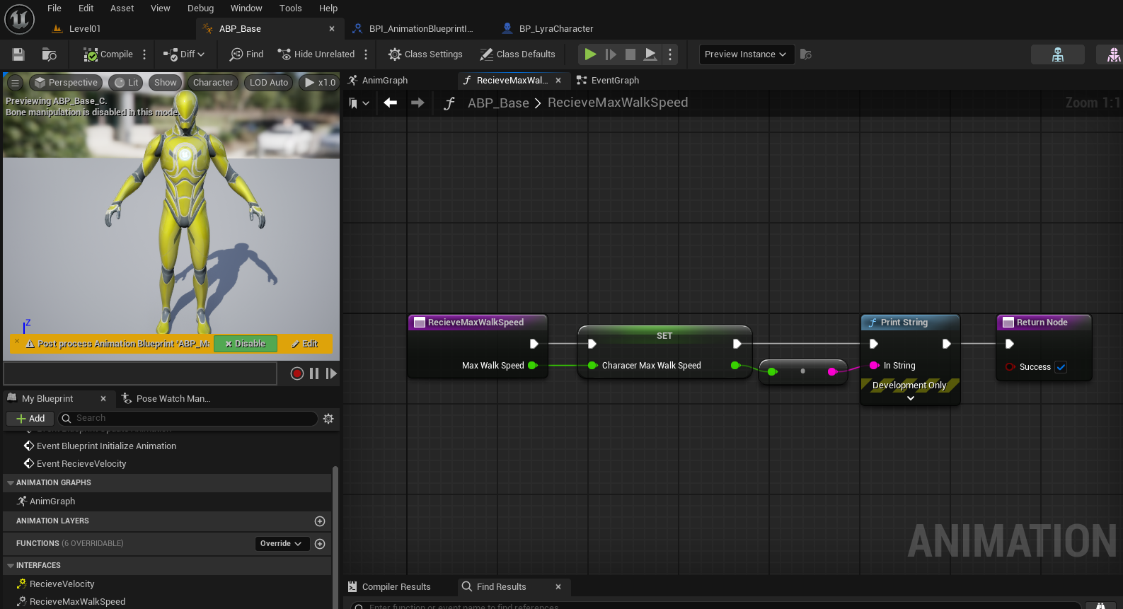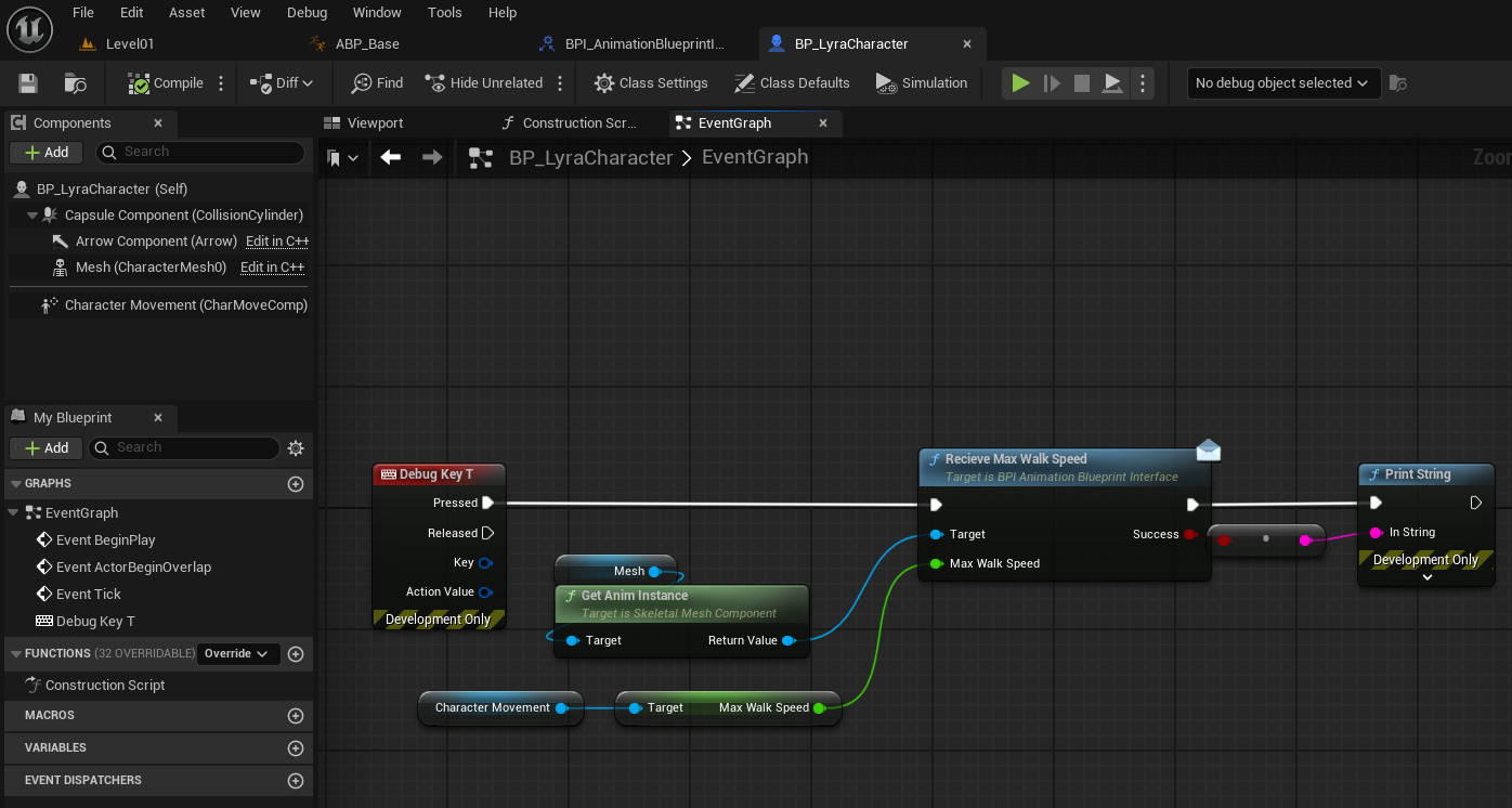 ⇒ ABP에 커스텀 함수 GetCharacerMovement를 추가하여 Property Access 노드로 가져온 Movement Component를CharacterMovement Component로 캐스팅하여 Return 해주면 된다.