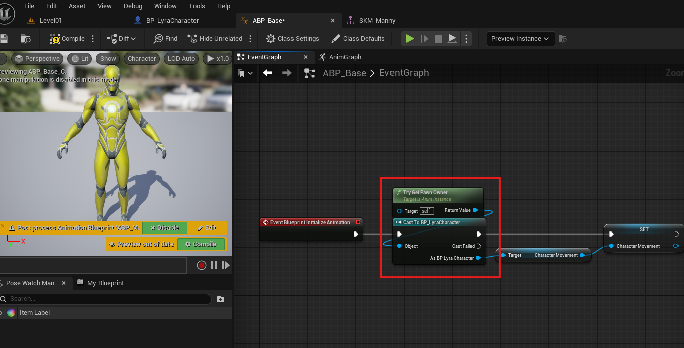 ABP에서 TryGetPawnOwner로 캐릭터 객체(Object)를 가져와 Casting 하여 원하는 정보를 가져오는 방법