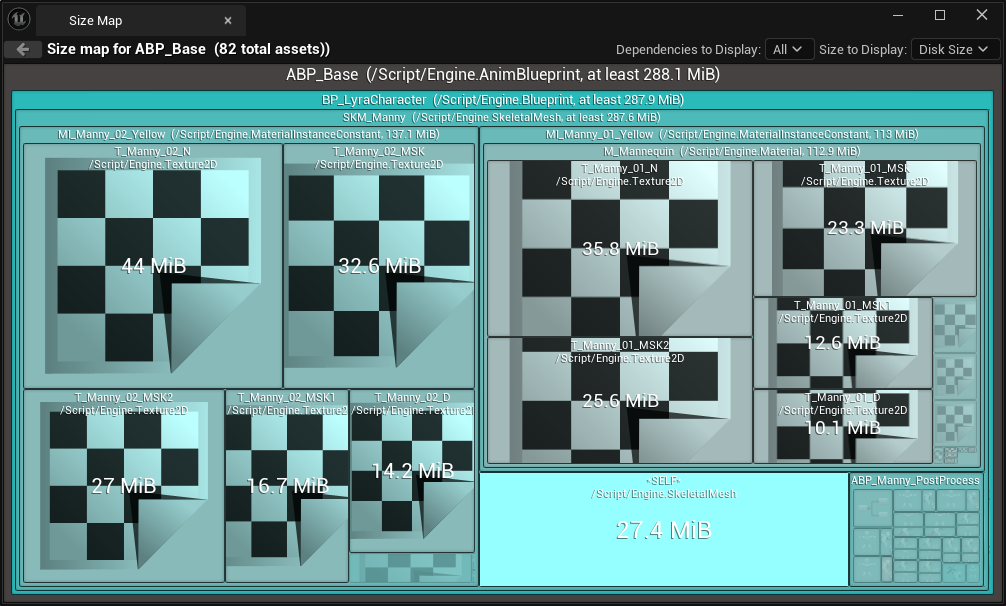 ABP_Base의 Size Map을 보면 BP_LyraCharacter가 통째로 포함되어 있는 것을 확인할 수 있다.