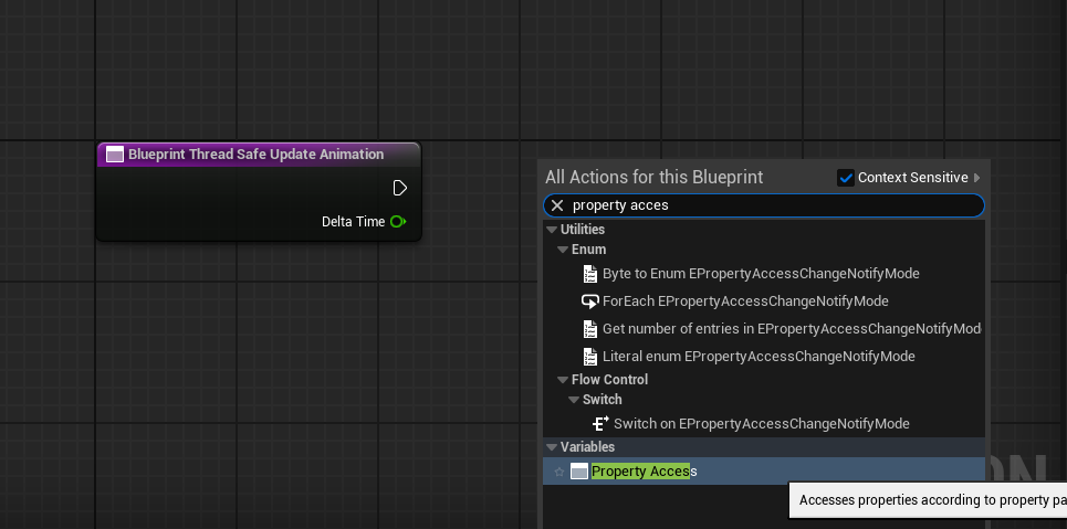 ex) 플레이어의 Input으로 캐릭터의 무기가 바뀌어서 Idle 모션을 바꿀 때 - 항상 변경되는 캐릭터의 값에 따라 애니메이션이 바뀌어야 할 때, 애니메이션에서 별도의 스레드로 항상 값을 감시하기 좋은 Property Access 사용