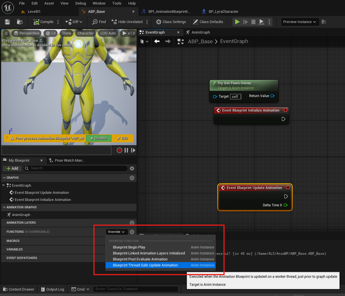 1. ABP에서 Blueprint Thread Safe Update Animations를 Override 해준다.
