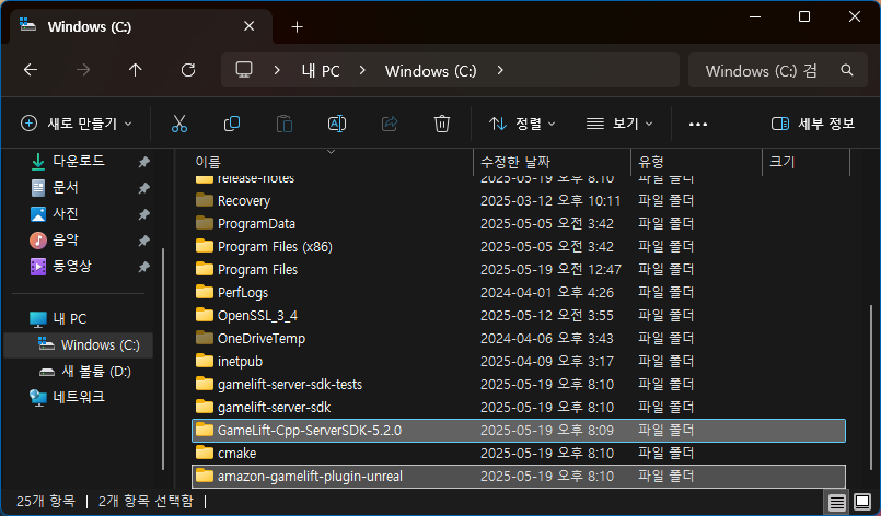 ๋ค์ด๋ฐ์ ํ์ผ์ ์์ถ์ ํ๋ฉด, ๋ ์์ถํ์ผ amazon-gamelift-plugin-unreal๊ณผ GameLift-Cpp-ServerSDK์ ํ์ธํ ์ ์๋๋ฐ, ์ด ๋ ์์ถ ํ์ผ์ download๊ฐ ์๋ C๋๋ผ์ด๋ธ์ ์์ถ์ ํผ๋ค.
