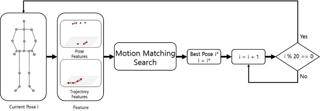 ๋ชจ์ ๋งค์นญ ๋ ธ๋๋ ํฌ์ฆ ํ์คํ ๋ฆฌ ๋ ธ๋๋ก๋ถํฐ ์์ง๋ ๊ธฐ์กด์ ์ ๋ณด์ Characetr Move Component์ ๋ชจ์ ๋ชจ๋ธ ์์ธก์ ์ฌ์ฉํด์ ์ง์ ๋ ๋ฐ์ดํฐ๋ฒ ์ด์ค์์ ๋ค์ ์ ๋๋ฉ์ด์ ์ ๊ฒ์ํจ. ๊ฒ์ ๊ฒฐ๊ณผ์ ๋ฐ๋ผ ํ์ฌ ํฌ์ฆ์ ์ฐ์๋์ง ์๋ ์ ๋๋ฉ์ด์ ์ ํฌ์ฆ๊ฐ ์ ํ๋ ๊ฒฝ์ฐ, ๋ชจ์ ๋งค์นญ ๋ ธ๋๋ ํ์ฌ ์ ๋๋ฉ์ด์ ํฌ์ฆ์ ์๋ก ์ ํ๋ ํฌ์ฆ๋ฅผ ๋ธ๋๋ฉ.